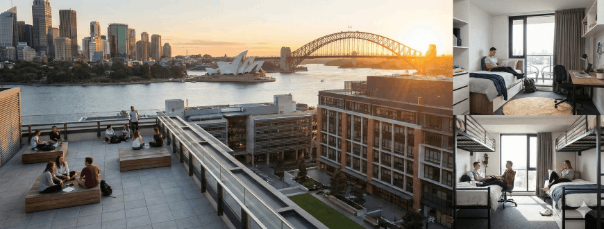 Sydney öğrencileri için şehir merkezindeki özel öğrenci yurtları (ör. Scape, Iglu) ve Surry Hills veya Pyrmont gibi banliyölerde paylaşımlı daireler popüler seçeneklerdir. Bu alternatifler kampüse kısa ulaşım süreleri ve şehir yaşamına kolay erişim sağlar.